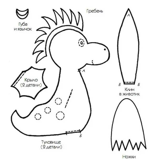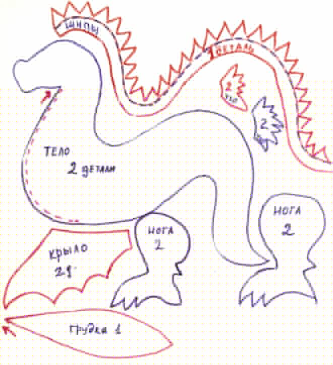 Чтобы получился ровный и симметричный дракон выкройку нужно нарисовать на плотной бумаге или картоне. Схема раскроя рисуется в соответствии с размерами готовой игрушки.
