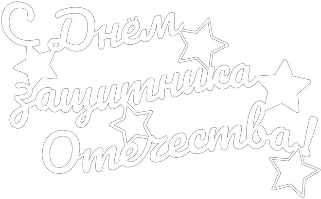 Поздравительная надпись – самый распространенный вариант вытынанки на 23 февраля на окна. Их можно цеплять не только на окна, но и просто использовать, как растяжки. В дополнение к надписям можно добавить изображение солдата, медалей, орденов, звезду, и т.д.